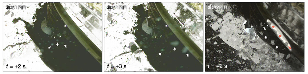 (左・中央)1回目の着地2秒後、3秒後のCAM-H画像。サンプラホーン下部から、矢印をつけた粒子がCAM-Hに向かって飛んでくるのがわかる。(右)2回目の着地2秒後のCAM-H画像。白矢印の粒子はロケット結合リング(打ち上げロケットに結合するためのリング状構造体)に映る影からセンチメートルサイズであることがわかる。画像クリックで拡大表示(提供:JAXA、以下同)