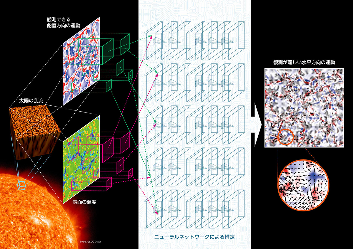 今回の研究の概念図。観測できる鉛直方向の運動と表面温度から、観測が難しい水平方向の運動をニューラルネットワークで高速に推定する。画像クリックで拡大表示(提供:国立天文台)