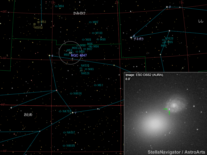NGC 4647周辺の星図と、DSS画像に表示した超新星。画像クリックで星図拡大(「ステラナビゲータ」で星図作成。DSS画像の版権について)