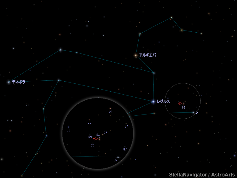 しし座R周辺の星図。数字は恒星の等級(64=6.4等)を表す。画像クリックで表示拡大(「ステラナビゲータ」で星図作成)