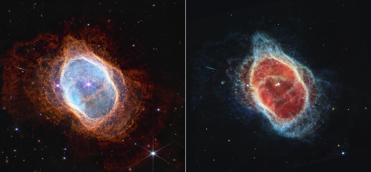 南の環状星雲NGC 3132。(左)赤外線カメラ(NIRCam)、(右)中間赤外線カメラ(MIRI)。画像クリックで表示拡大
