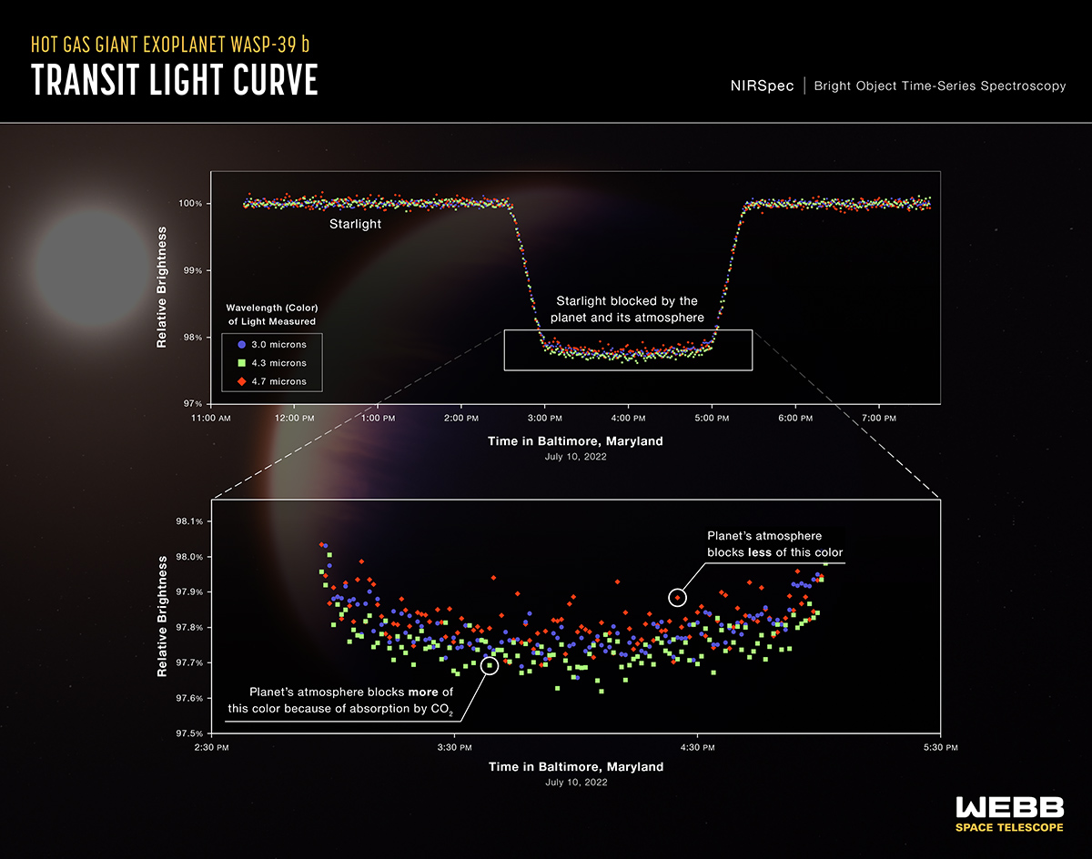 二酸化炭素が存在する決定的な証拠は、今年7月10日に実施されたジェームズ・ウェッブ宇宙望遠鏡(JWST)の近赤外線分光器(NIRSpec)による分光観測から得られた。JWSTによる初期リリース科学プログラムの一環として、いち早く系外惑星のデータを提供するための観測が実施されていて、WASP-39 bもその対象となっていた。