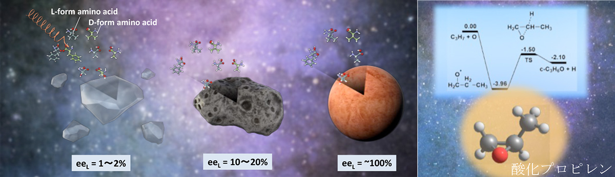 筑波大学計算科学研究センターの堀優太さんたちの研究チームは、宇宙空間で初めて検出されたキラル分子である酸化プロピレン(CH3CHOCH2)に着目し、宇宙空間で酸化プロピレンにホモキラリティーが生じるかどうかを量子化学計算で調べた。