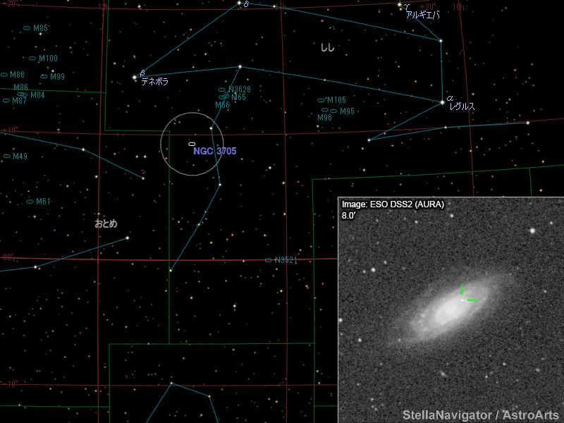 NGC 3705周辺の星図と、DSS画像に表示した超新星。画像クリックで星図拡大(「ステラナビゲータ」で星図作成。DSS画像の版権について)