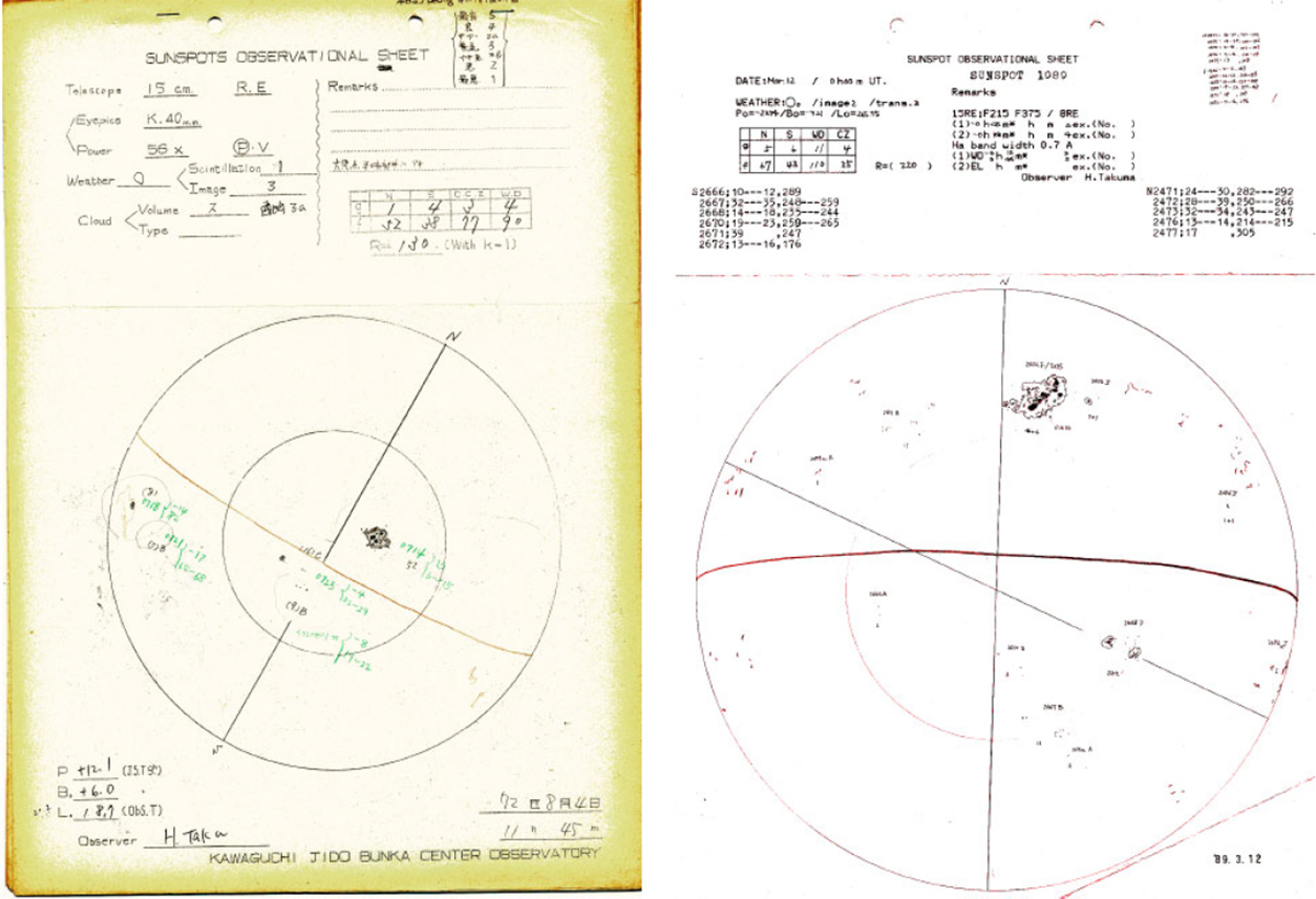 川口市立科学館所蔵の黒点観測記録群。(左)1972年8月4日、(右)1989年3月12日。巨大な太陽嵐を起こした太陽黒点の様子がよくとらえられている。画像クリックで拡大表示(提供:川口市立科学館)