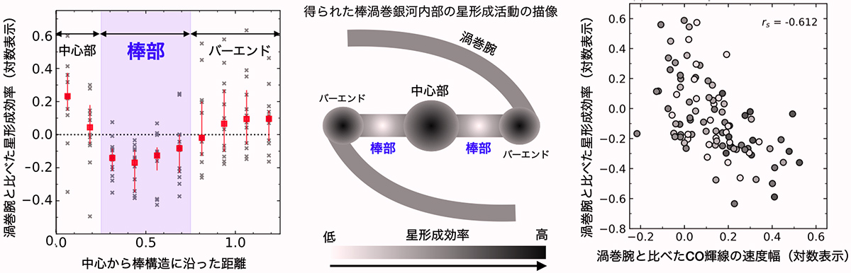 (左)棒渦巻銀河の中心部からの距離と星形成効率の関係。渦巻腕に比べて棒部の星形成効率が低い。(中)今回得られた棒渦巻銀河内部の星形成活動の描像。(右)棒部とバーエンド領域の、星形成効率と一酸化炭素分子輝線の速度幅の関係。渦巻腕と比べて速度幅が大きいほど星形成効率が低くなる。画像クリックで拡大表示
