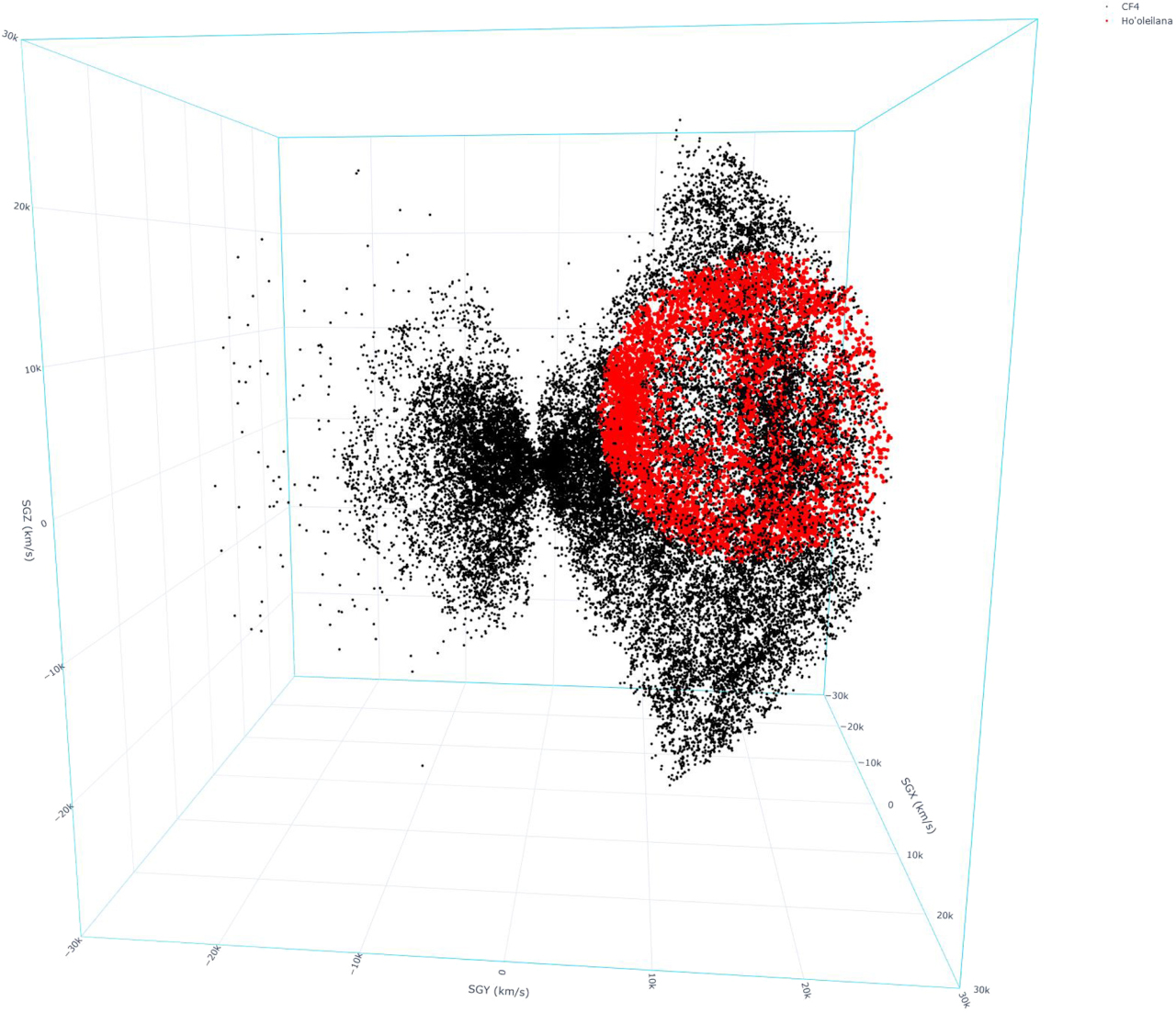 銀河カタログ「Cosmicflows-4」の銀河(黒色の点)を3次元プロットした図。天の川に重なる方向の銀河は観測できないため、2つの円錐を合わせた形の分布になり、円錐の頂点に私たちの天の川銀河がある。赤色の点がシェル構造「ホオレイラナ」の位置に対応する銀河。画像クリックで表示拡大(提供:Tully et al. (2023))