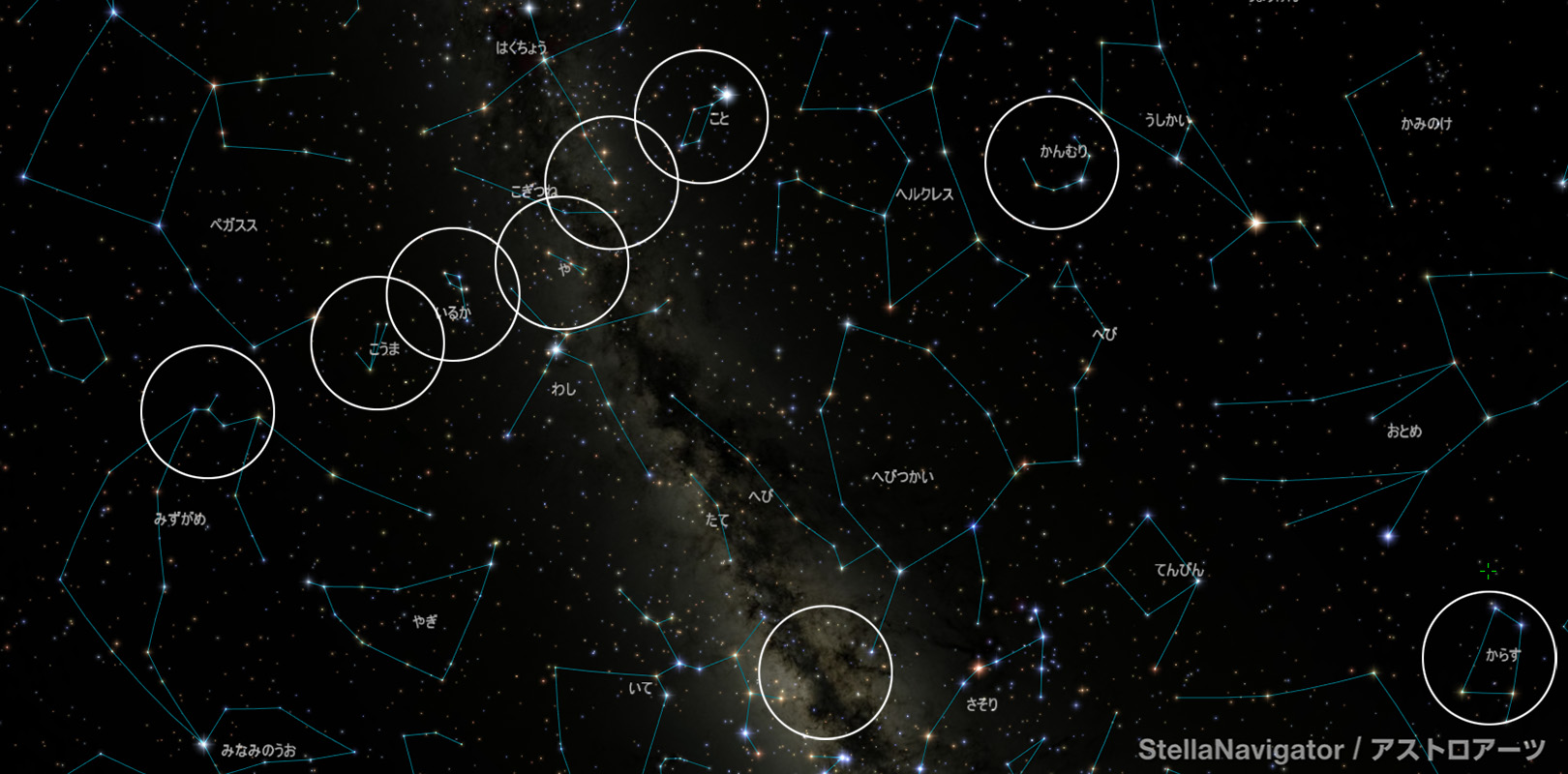 実視界15°の広さで小型星座を楽しんだり、天の川暗黒帯を見ることができる。クリックで拡大