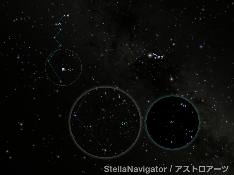 とかげ座BL周辺の星図。数字は恒星の等級(130=13.0等)を表す。画像クリックで表示拡大(「ステラナビゲータ」で星図作成)