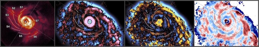 (左)ヨーロッパ南天天文台のVLT望遠鏡で撮影されたぎょしゃ座ABの原始惑星系円盤。(右の3つ)アルマ望遠鏡でとらえられた同じ原始惑星系円盤の渦巻腕。画像クリックで表示拡大(提供:ALMA (ESO/NAOJ/NSF NRAO), VLT/SPHERE (ESO), Speedie et al.)