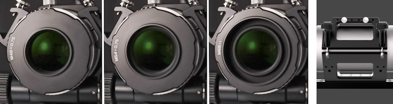 - 接眼部後端に取り付ける「M48×0.75mm」「M54×0.75mm」「M68×1mm」の3種類のアダプターを付属。アダプターを交換することで、光路長を変えることなく、使用している機材に合わせた接続ができる。