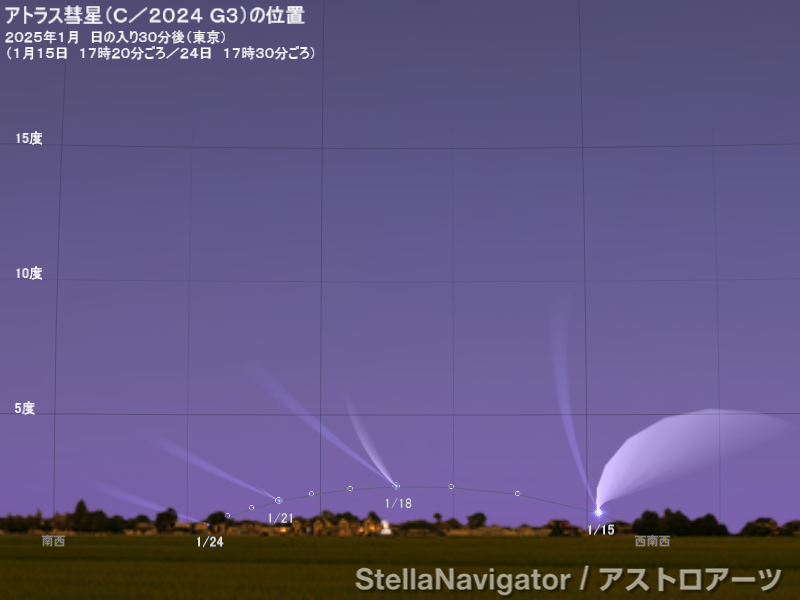 アトラス彗星は2024年4月に、アトラスプロジェクトの一つであるチリの望遠鏡によって発見された非周期彗星だ。1月10日ごろまでは明け方の東南東の空にあり、日の出30分前で5度未満と超低空ながら双眼鏡での観察や写真撮影でとらえられていた。
