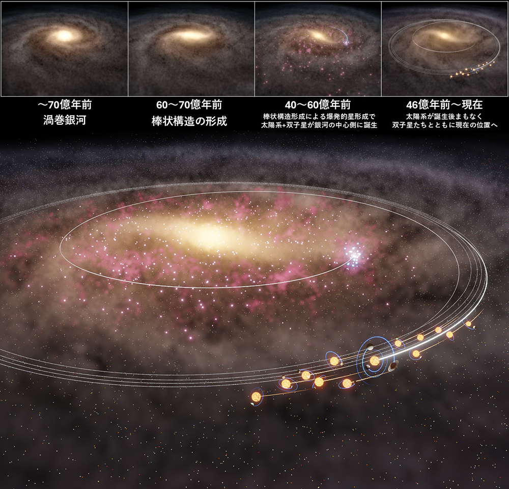 (上)今回の研究で提案された太陽系大移動のメカニズム、(下)太陽系と太陽双子星たちの大移動のイメージ。画像クリックで表示拡大