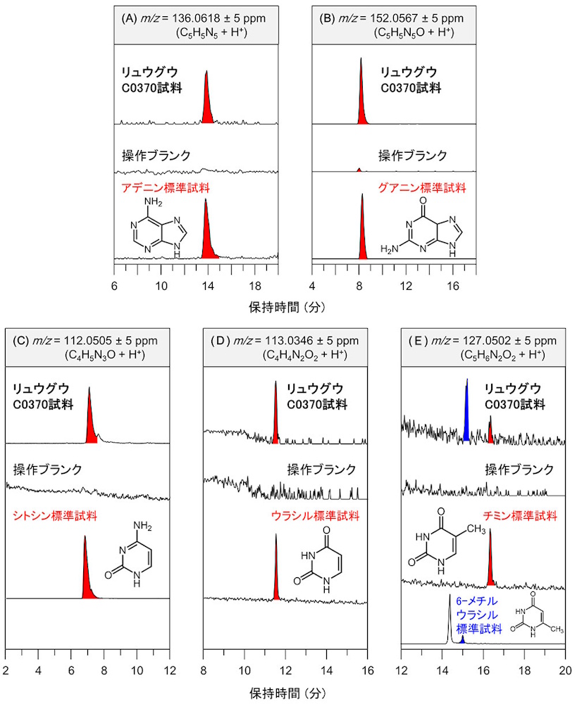 HPLC/HRMSによって検出されたリュウグウ試料の塩酸抽出液中の核酸塩基。(A)アデニン、(B)グアニン、(C)シトシン、(D)ウラシル、(E)チミンおよび6-メチルウラシルに対応するマスクロマトグラムを示す。画像クリックで表示拡大