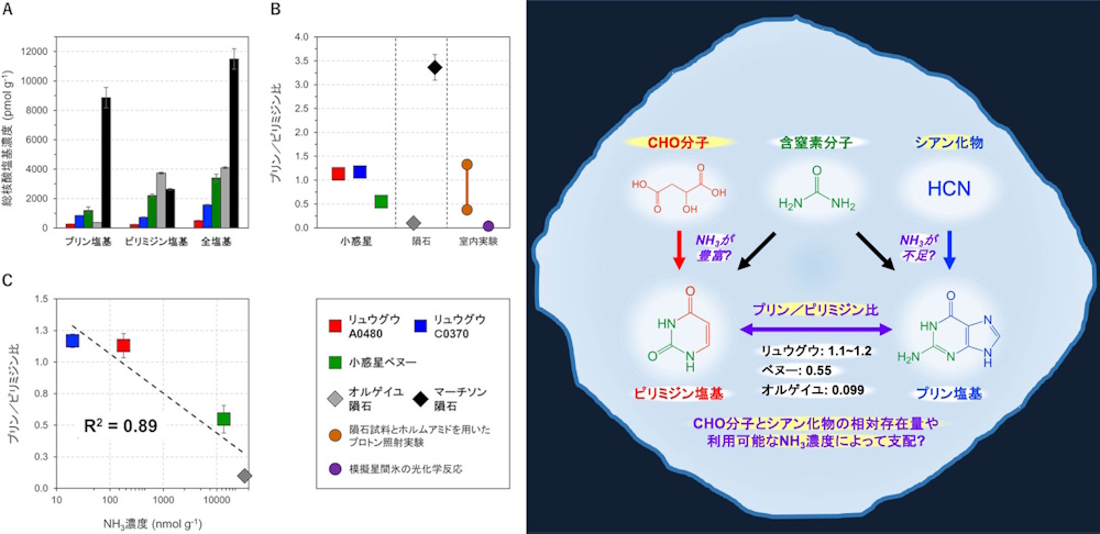 (左)リュウグウとその他の地球外物質試料中の核酸塩基分布の比較。(A)リュウグウ、ベンヌ、オルゲイユ隕石、マーチソン隕石中のプリン塩基、ピリミジン塩基、全核酸塩基の濃度を示した棒グラフ。リュウグウの核酸塩基濃度は他試料よりも小さいことがわかる。(B)各試料におけるプリン/ピリミジン比(過去に実施された室内実験での値も含む)。(C)リュウグウ、べンヌ、オルゲイユ隕石において観察されたプリン/ピリミジン比とアンモニア濃度の負の相関。