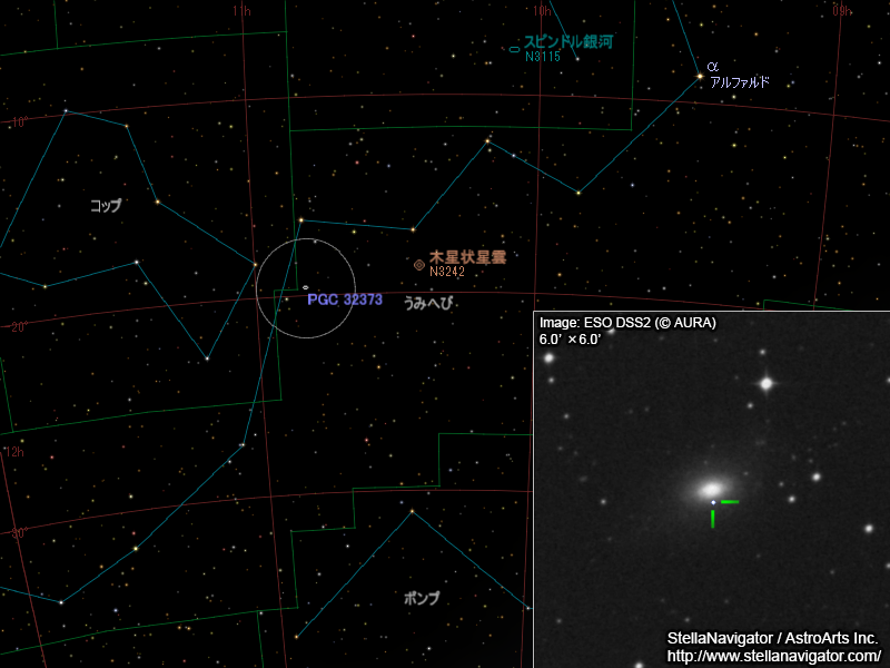 PGC 32373周辺の星図と、DSS画像に表示した超新星。クリックで拡大(「ステラナビゲータ」で星図作成。DSS画像の版権について)