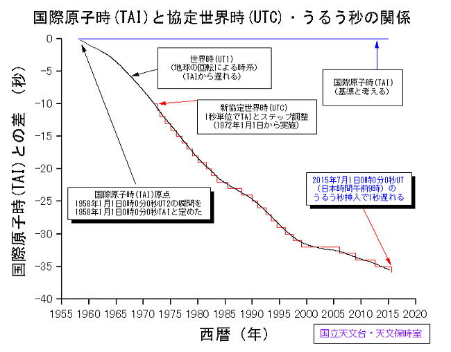 かつて時刻は、地球の公転・自転に基づく天文時(世界時)から決められていたが、1958年からは原子の振動を利用した原子時計に基づく国際原子時が開始され、1秒の長さ(時間の単位)が非常に高精度になった。月の引力による潮汐の影響で地球の自転にブレーキがかかるなどの理由により、地球の自転が少しずつ遅くなっているため、原子時計に基づく時刻と天文時に基づく時刻との間ではずれが生じている。