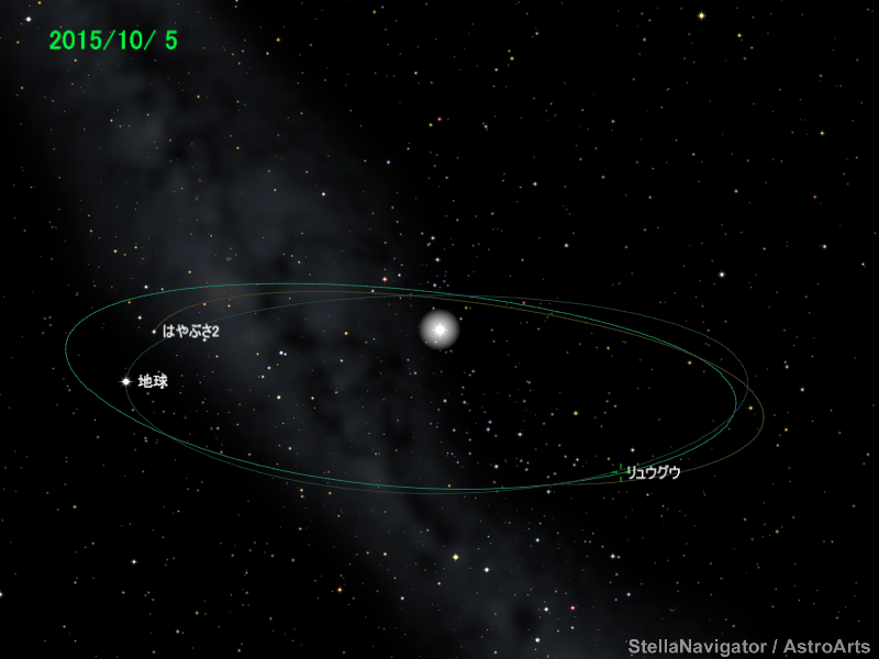 2015年10月5日の地球とリュウグウ、「はやぶさ2」の位置。クリックで拡大(「ステラナビゲータ」で星図作成、以下同)
