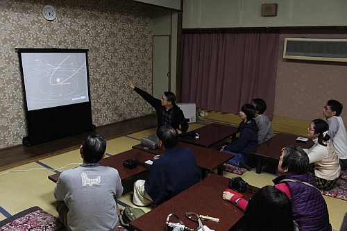(1枚目)観察・撮影前のレクチャー、(2枚目)大島温泉ホテル外観