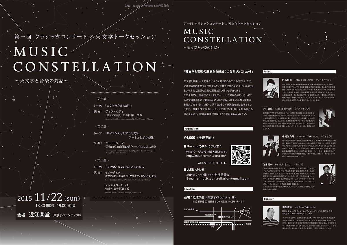 古く同じ学問とされていた天文学と音楽の共通点と現状にスポットライトを当てるため、天文学のエキスパートである高梨直紘氏(東京大学特任准教授)による、宇宙と音楽をテーマとした三部構成のトークを軸に、各章にふさわしいクラシック楽曲の演目を、第84回日本音楽コンクール第3位の若手 小林壱成氏、読売交響楽団 對馬哲男氏、NHK交響楽団 中村洋乃理氏、京都大学出身のチェリスト 佐古健一氏の才能溢れる4名のアーティスト達が演奏します。