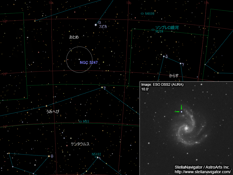 NGC 5247周辺の星図と、DSS画像に表示した超新星。クリックで拡大(「ステラナビゲータ」で星図作成。DSS画像の版権について)