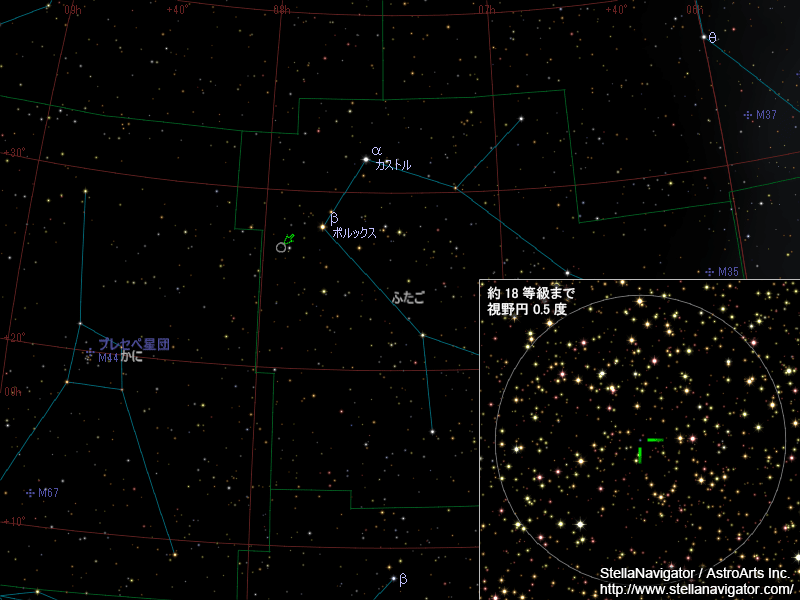 この天体を天文シミュレーションソフトウェア「ステラナビゲータ」で表示して位置を確認できます。まず「ツール」メニュー→「データ更新」で新天体データを取得してから、「ふたご座の矮新星(2014)」を検索・表示してください。