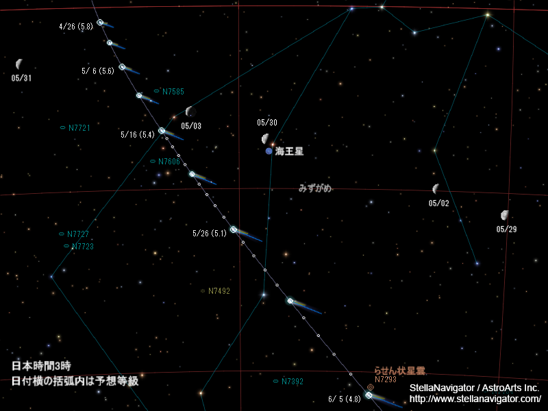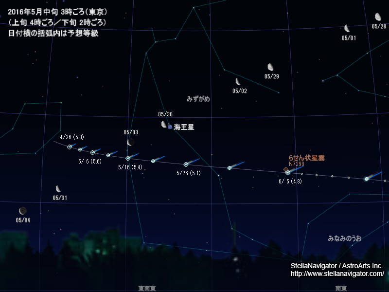 5月にパンスターズ彗星(C/2013 X1)が5等台まで明るくなると予想されている。うお座からみずがめ座を動いていて、明け方の南東の空に見える。近くには海王星もあり、大型の双眼鏡なら同一視野に見えるかもしれない。やや低く、町明かりや建物の影響を受けやすいので、条件の良い観察場所を探しておこう。