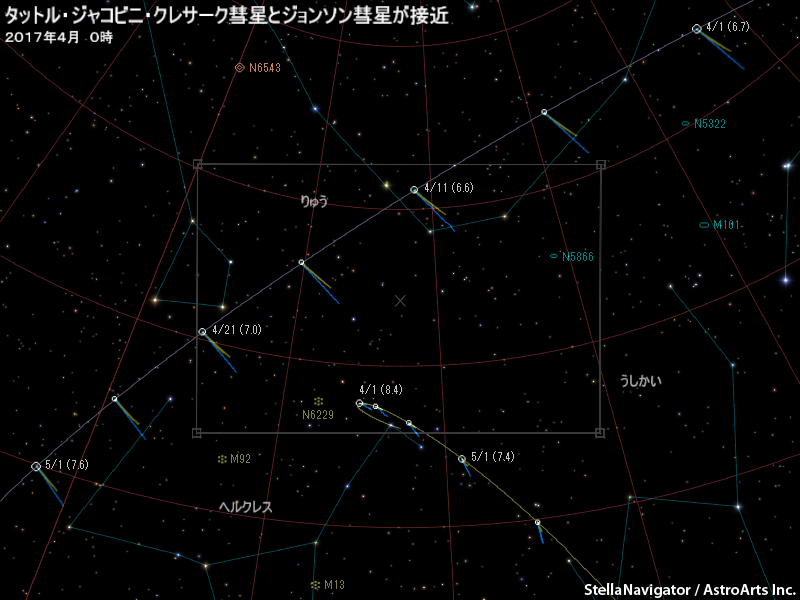 3月下旬から4月下旬ごろまで、タットル・ジャコビニ・クレサーク彗星(41P)が7等前後まで明るくなって見えると予想されている。おおぐま座からりゅう座と北天の星座を通っていくのでほぼ一晩中見え、条件が良い。北斗七星や、りゅう座の頭を目印にして、双眼鏡や天体望遠鏡で観察したり撮影したりしてみよう。4月下旬にはジョンソン彗星(C/2015 V2)と15度前後まで近づく。