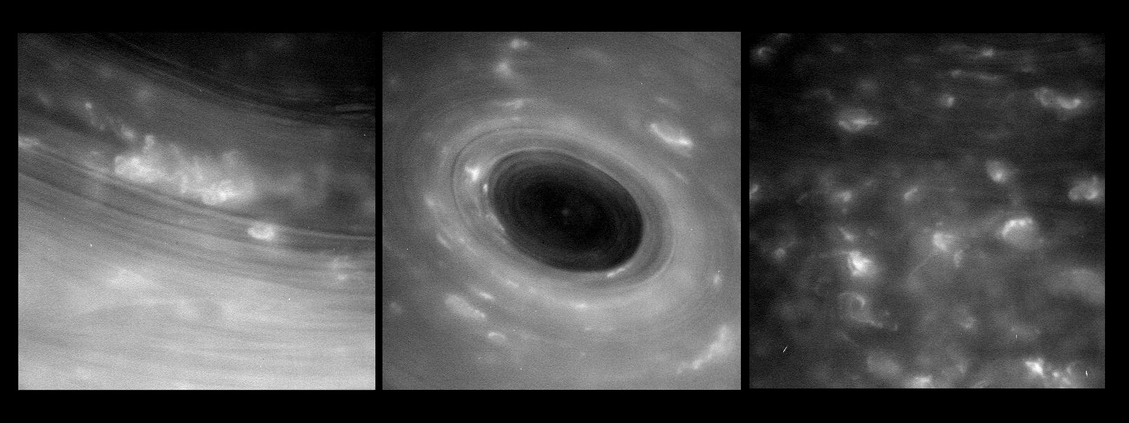 地球へ送信されてきた未加工画像には、これまでで最も土星に近いところからとらえられた大気中の渦のような模様や、乱流のようなものが鮮明に写し出されている。