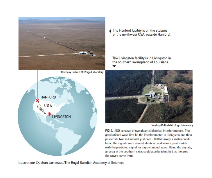レーザー干渉計型重力波検出器「LIGO」。設置場所はそれぞれ(左上)米・ワシントン州ハンフォード、(右下)ルイジアナ州リビングストン。クリックで画像拡大(提供:LIGO Collaboration、イラスト:Johan Jarnestad/The Royal Swedish Academy of Sciences)