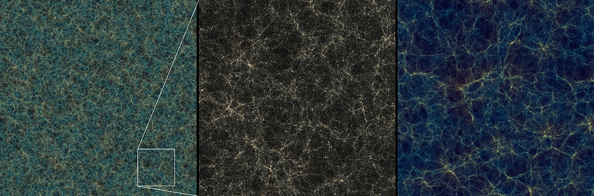 ダークマター粒子の重力を計算し、宇宙の大規模構造ができる様子を計算したシミュレーション結果。左と中はアテルイ、右はアテルイIIによる。アテルイIIでは、銀河を宿すダークマターハロー(ダークマターの塊)の細部の構造まで分解できている。画像クリックで表示拡大(提供:千葉大学 石山智明)