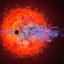 ビッグバンからわずか6億年後の宇宙に存在した銀河で、暗黒星雲と散光星雲の分布がとらえられた。巨大な星団が誕生し、相次ぐ超新星爆発で巨大な空洞が形成されている可能性がある。