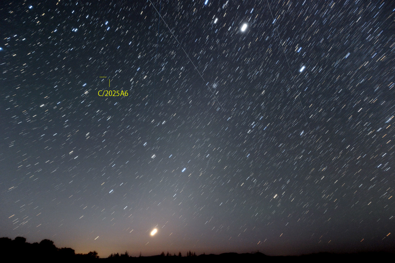今シーズン初めての黄道光撮影となりました。金星と木星がいて、にぎやかな明け方の空です。 左上にレモン彗星(C/2025 A6)頭部が写っていました。