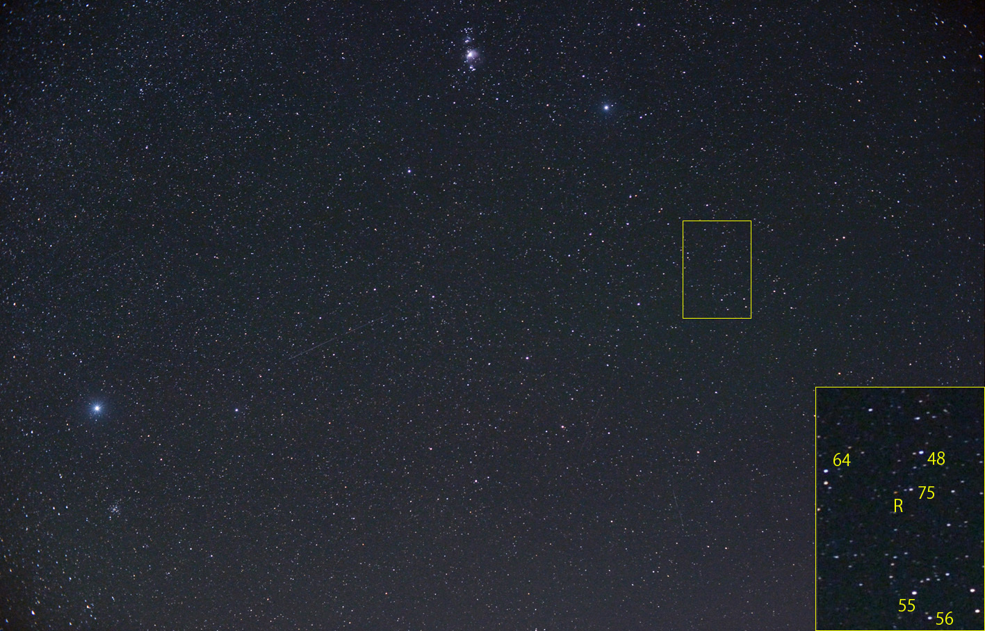 10月18日うさぎ座R星が極大(5.5~11.7等、周期445日)とあり、撮影。 平沢AAVSO星図との比較では、Rの光度は8等以下と見積もられ暗いです。