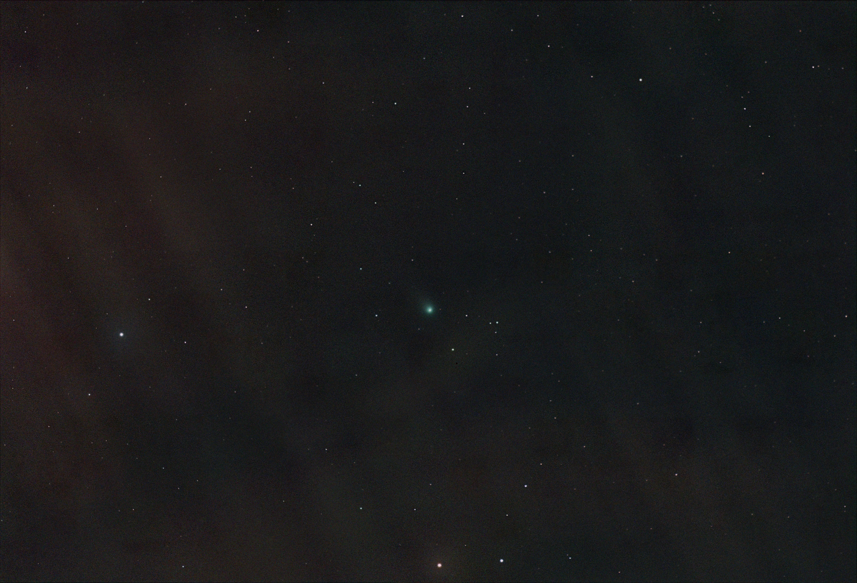 10/06早朝のレモン彗星(C/2025 A6)です。早朝だけ晴れる天気予報(tenki.jp)を信じてASIAir ProのPlan(03:30開始)撮影を仕込んで寝ました。朝、起きて空を見上げるとちょっとだけ青空が見えていたので期待しましたが、最初の5枚だけ星が写っていました。しかも撮影開始が03:54なので、20分近く、彗星を探し、やっと撮影できた様です。流れる雲を通してでしたが。