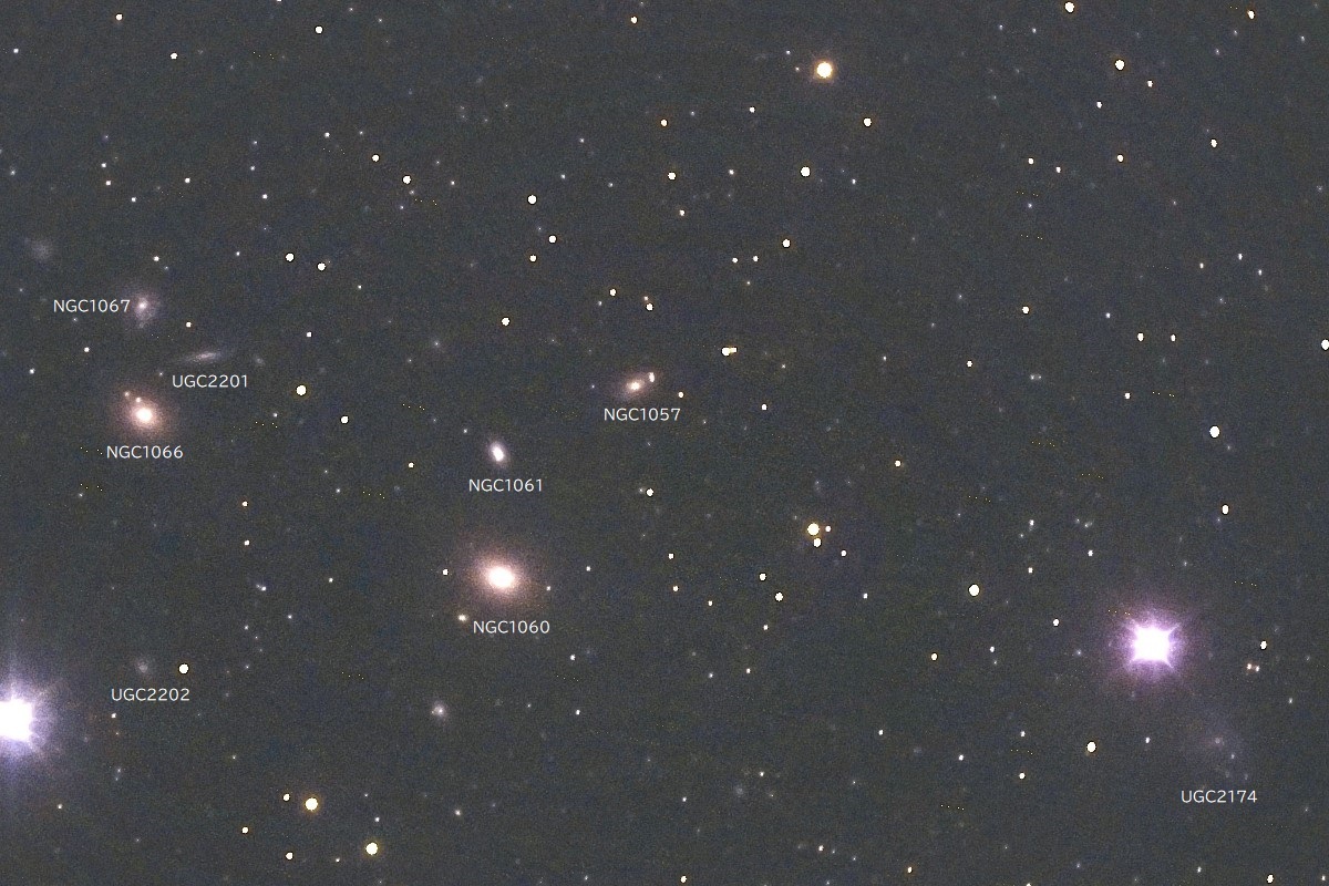 さんかく座の東端、ペルセウス座まであと1.5度ほどのところに位置する銀河群です。 一番明るいNGC1060はE-S0タイプの銀河で、11.82等(Ⅴ)、右下隅の大きく淡いのはUGC2174で、15.20等(B) 下方、左右の輝星は7等星です。