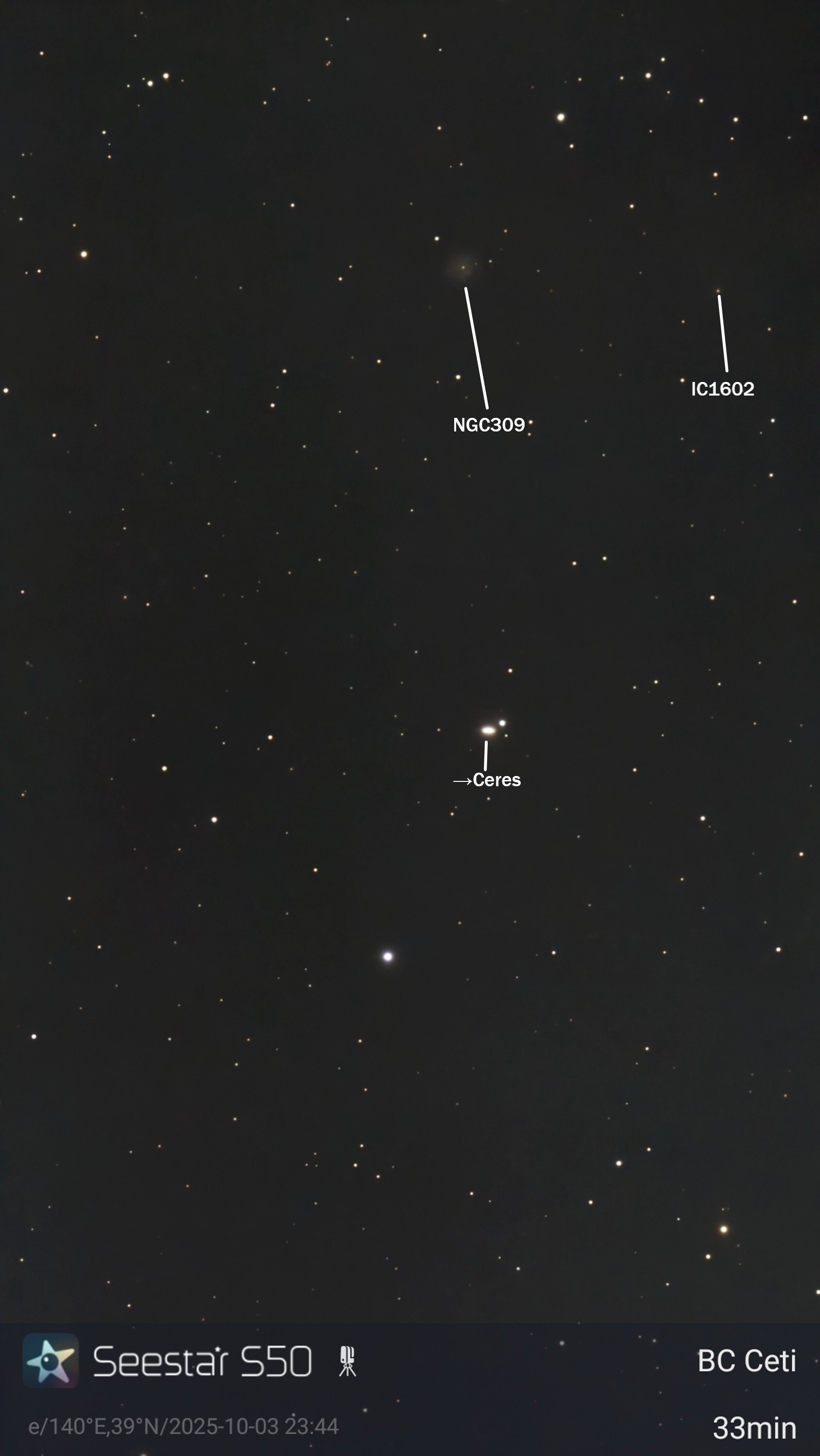 この日の19時19分ごろ、ケレスが地球最近でした。矢印方向に運動しています。
