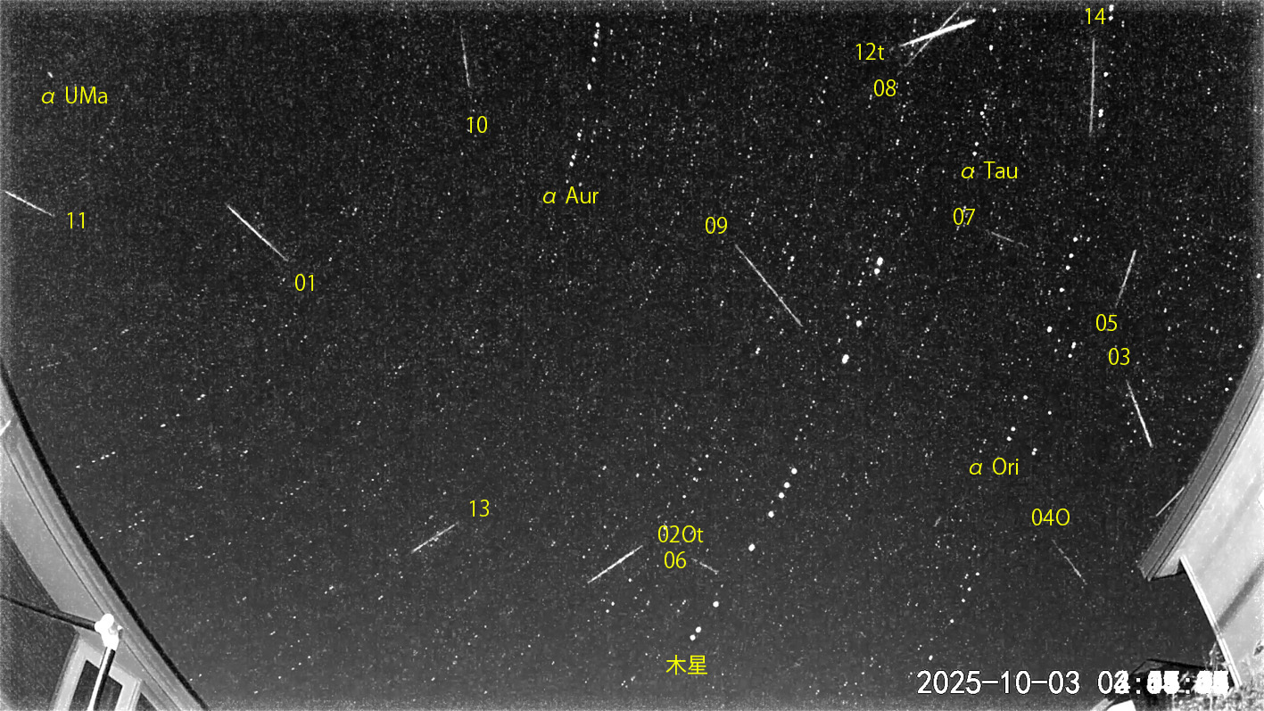 02:01から約2.5時間の14コマを処理しました。 出現した順に数字と記号を始点付近に記入。tは痕traceあり。O:オリオン座流星群 10月になって、おうし座南群やオリオン群が活動を始めました。