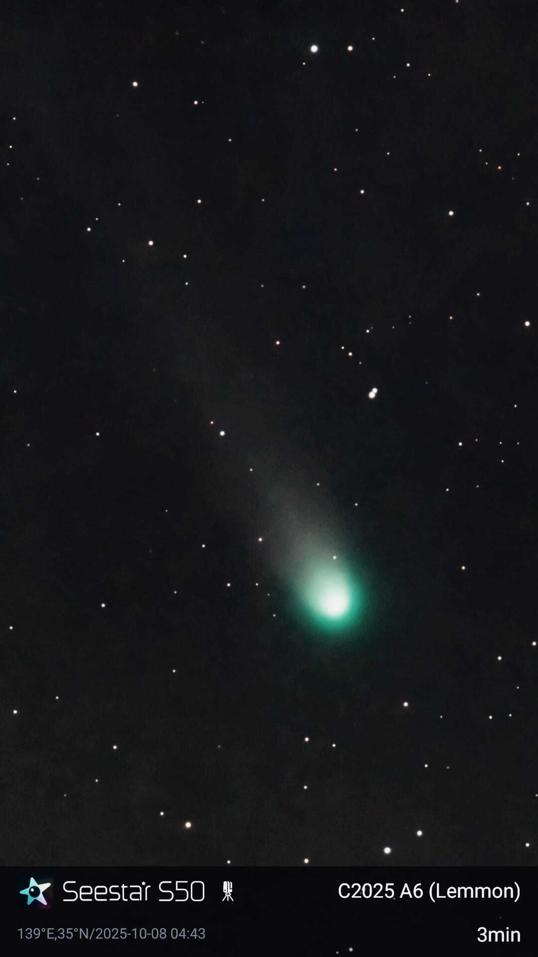 今朝は天気予報が外れ、快晴の空でレモン彗星を撮影しました。 彗星の動きが早いので、露光は3分に。