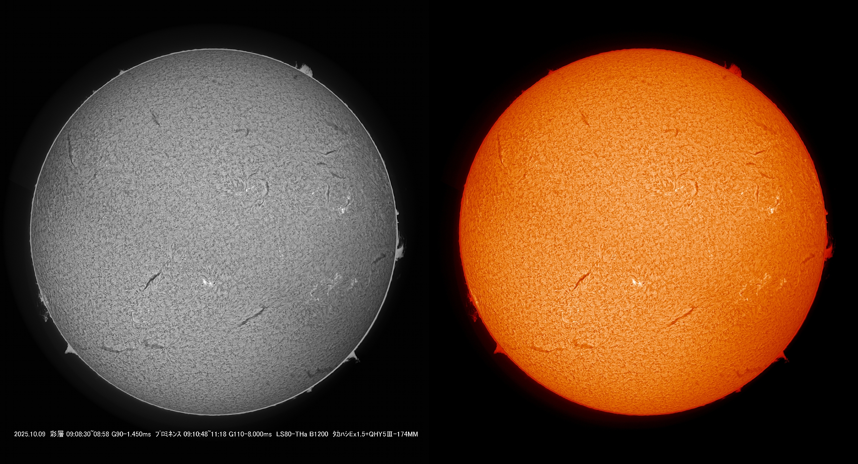 光球面とプロミネンスを2分割で個別に撮影して合成・擬似カラー化。