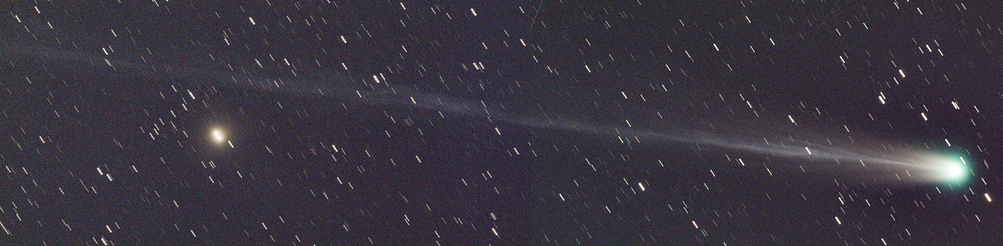 今朝の阿蘇二重の峠あたりは雲の中でした。やむなく自宅そばへ下りて、農道わきにて撮影しました。月齢20日の月明かりはきついですが、彗星は明るく尾はこの画像で3度強あります。120s7枚から強調した2枚を合成し、トリミングしています。眼視では3cm双眼で明瞭、88mm双眼で立派なコマから伸びる1度程の尾がわかりました。。