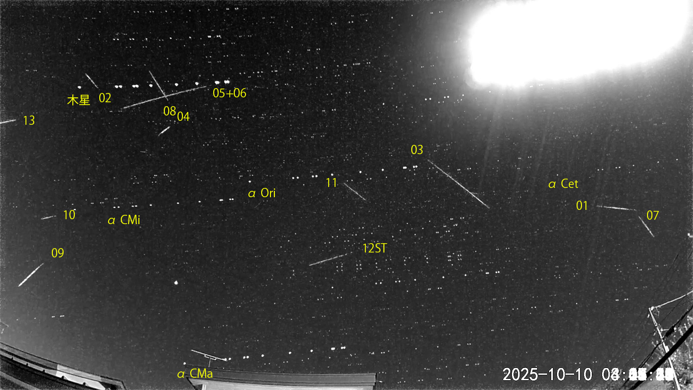 02:05から約2.5時間の13コマを処理しました。 出現した順に数字と記号を始点付近に記入。tは痕traceあり。O:オリオン座流星群、ST:おうし座南流星群