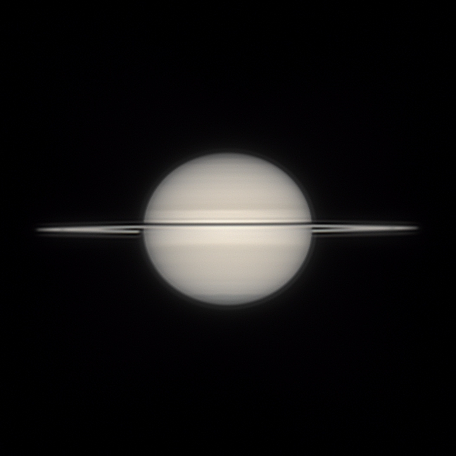 スワン彗星(C/2025 R2)撮影後、快晴になったためそのまま土星を撮影しました。シーイング予報も良かったのですが、観測室と望遠鏡を外気になじませる時間をたっぷり取れたこともあって安定した気流で撮影できました。半月ぶりの土星の輪は影は戻りましたがかなり薄くなっていました。