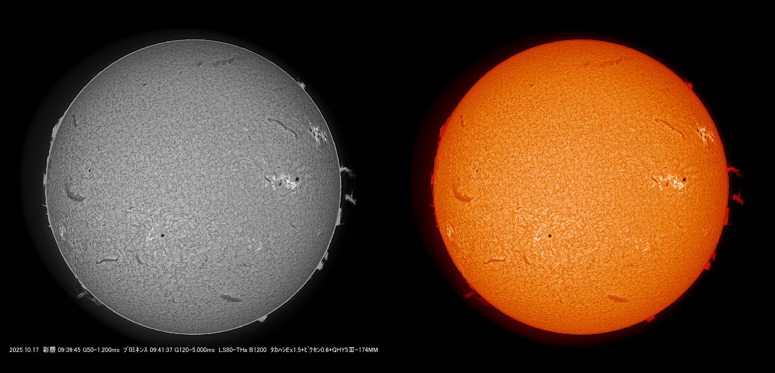 光球面とプロミネンスを個別に撮影して2画像を合成・擬似カラー化。今日(10/18)は悪天候だったので昨日の画像ですが、最悪のシイーングで拡大画像は処理を諦めました