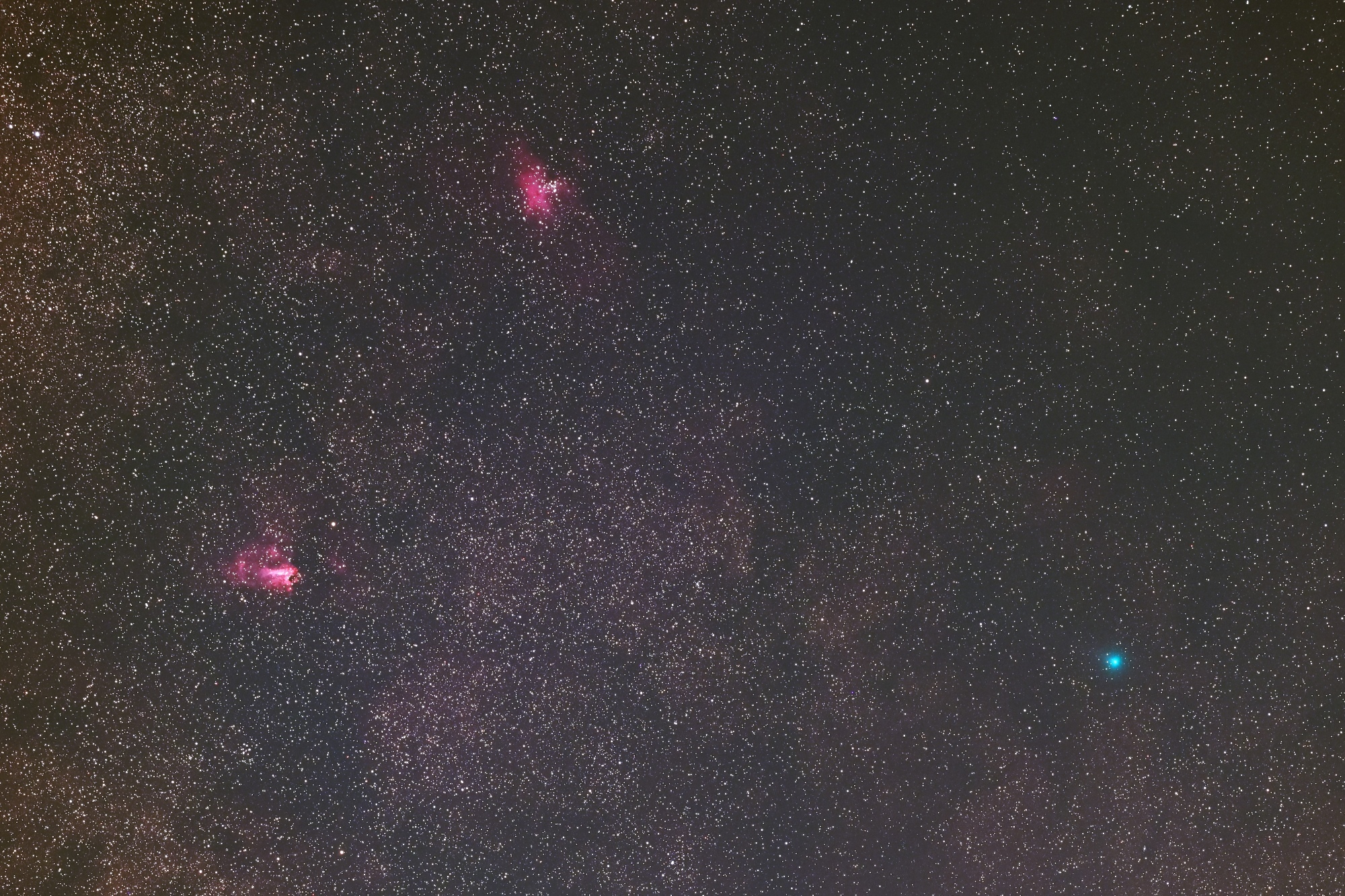M16・17・18の近くを通過するスワン彗星です。尾をあぶり出すとカラーバランスが大きく崩れてしまうので、尾は諦めて、全体的に自然な感じの色調に仕上げてみました。