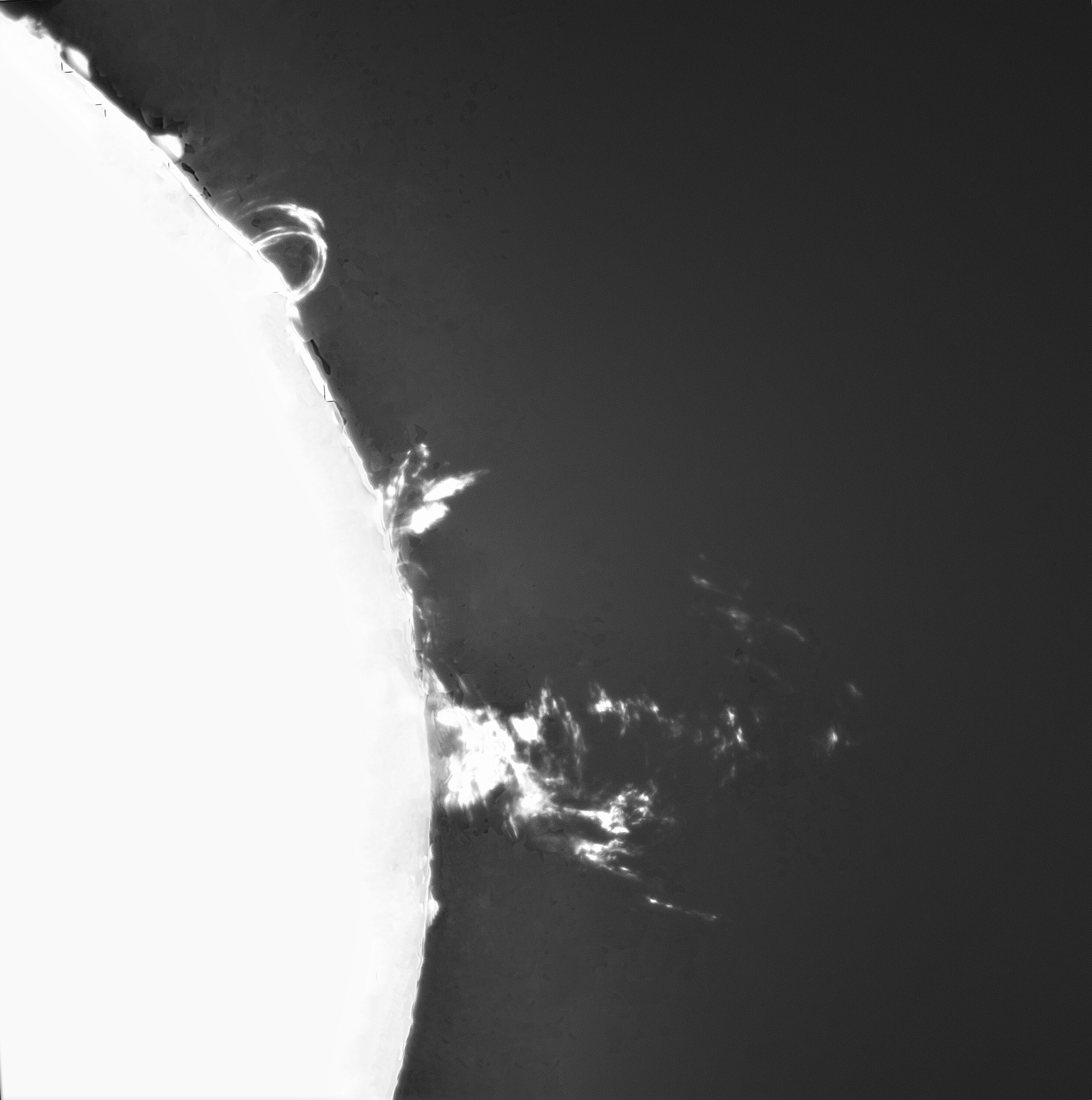 14:27(JST)最大 M1.0のフレアが、4246の下の4248でありました。コロナ質量放出(プロミネンス噴出?)を伴っていて、 4246で形成され続けているループプロミネンスと同時に観察できました。 (ただ、如何せん北風に乗って雲が流れ込んでいる状況で、背景や光球面はムラだらけになりました。) (今回は画像回転させない方が実感が強いように思えたので、再投稿。)