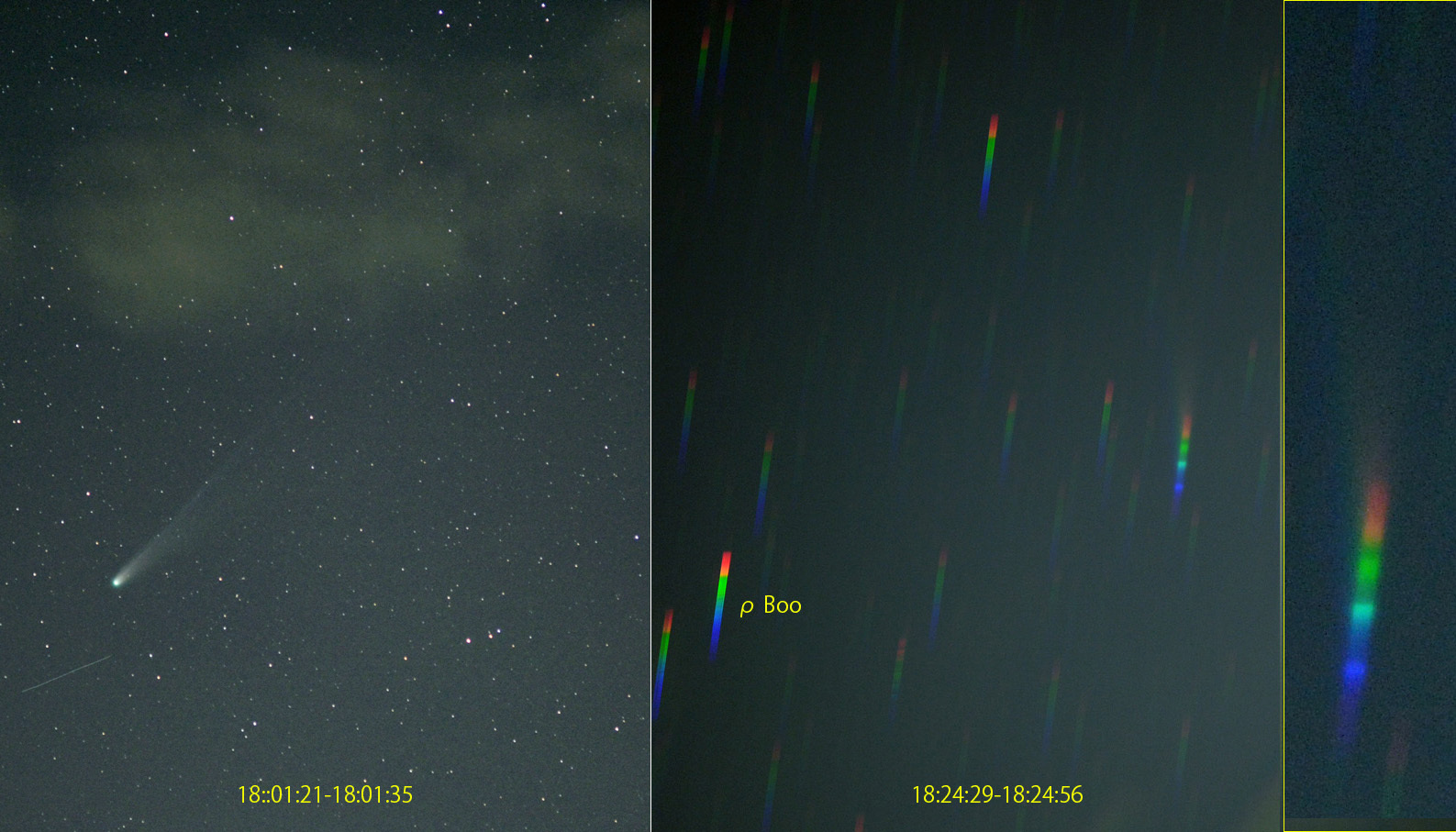 スペクトル画像:レンズ同じ、ISO3200、F4、露出27秒、タカハシ分光プリズム 頭部は肉眼で容易に見え4.5等程度、ダストテイルは8x56双眼鏡で3.5゜程度に見受けられました。 寒気の入りで流れ雲多し。晴れ、気温1℃、弱風。10月とは思えないほど寒かった。