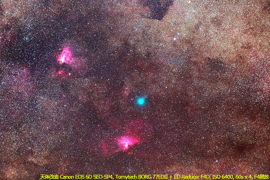 赤い星雲とランデブーするというので天体改造機を使いました。 彗星高度は約34度。残念ながら1か月前と違って、尾が彗星核の後方に回り込んでいる模様で、その尾の長さは1/10以下になってしまいました。 郊外にある撮影地では天の川が街灯みたいに明るいので、それに掻き消されたという言い方も出来ると思います。
