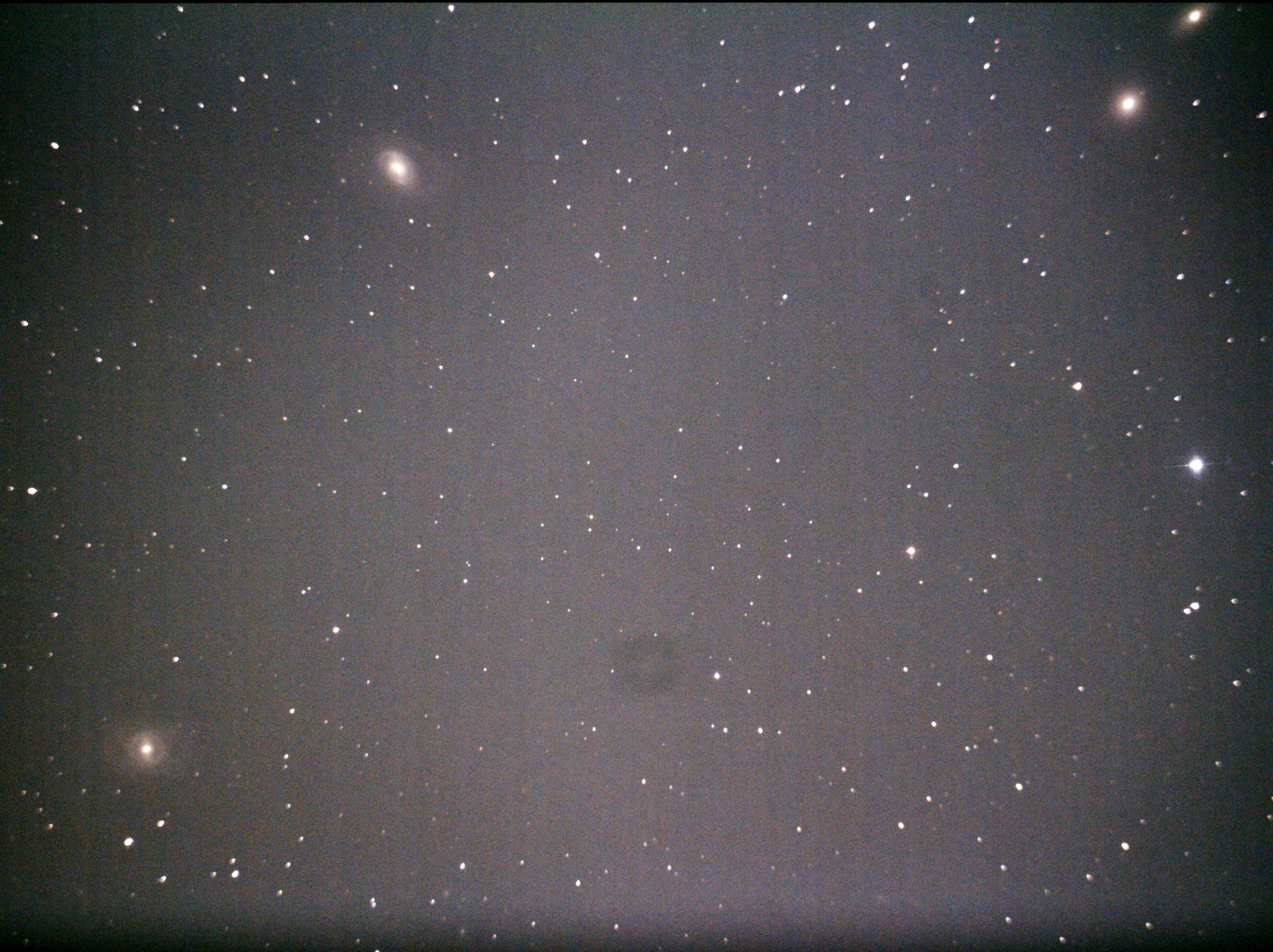 左下の棒渦巻銀河がM95、左上の渦巻銀河がM96、右上の楕円銀河がM105、そのさらに右上の上端がはみ出した銀河がNGC3384です。これらの銀河はM96銀河群に属しています。私がこれらの銀河を撮影するのは初めてです。「しし座の第二トリオ」と自分で勝手に名前を付けて喜んでいましたが、M95・M96・M105の3つの銀河を焦点距離800mmの同一写野に収めるにはかなり無理があることが分かりました。銀河が写野の端の方に来るので、ぼやけて形が崩れてしまいました。