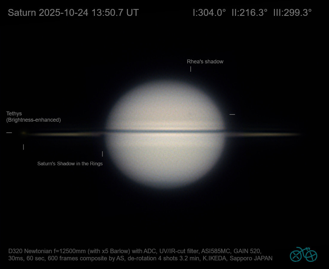 環がどんどん細くなっています。 シーイングは良くなかったのですが、低比率ながらも良い状態の瞬間があるタイプで、比較的良好な絵になりました。(1時間くらい撮影した中の4枚ですが...) 土星の影がなんとか分かりました。テティスは切り出してそこだけ輝度を調整しています。 レアの影はかろうじて写っている、と言っていいのでしょうか...遠目にして写真を動かすとわずかに暗くなっている様に見えます。 レアの本体は土星の上にあり、エンケラドゥスは環の少し上にあるはずですが、全く判別できません。 環が最細の時に良いシーイングに出会いたいものです。